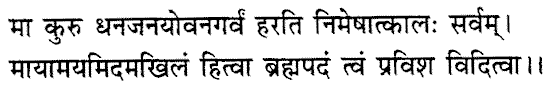 Do not be proud of wealth, kindred and youth; Time takes away all these in a moment. Leaving aside this entire (World) which is of the nature of an illusion, and knowing the state of Brahman, enter into it.