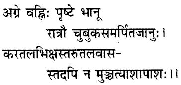 In front, there is fire; at the back, there is the sun; in the night, (the ascetic sits) with the knees stuck to the chin; he receives alms in his palms, and lives under the trees; yet the bondage of desire does not leave him.