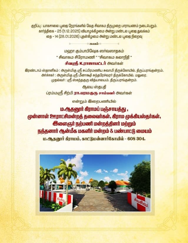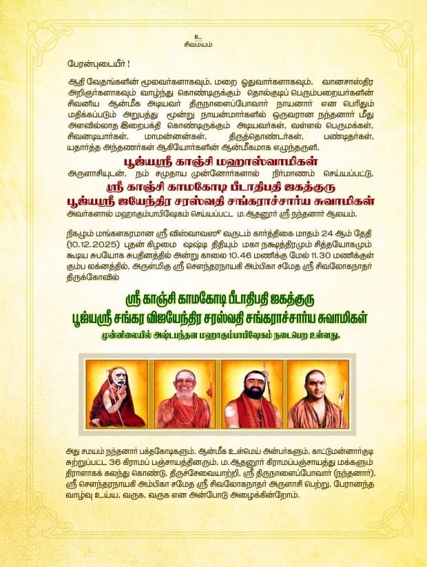Aadhanur Sri Thirunaallaippovaar Nayanmar (Sri Nandanar) Sri Sowndaranayaki Amba sameta Sri Sivalokanatha Swami Temple Maha #Kumbhabishekam will be performed on Wednesday, 10th Dec 2025 with the benign presence of Sri Kanchi Kamakoti Peetadhipati Jagadguru Pujyashri Shankara Vijayendra Saraswathi Shankaracharya Swamigal at M. Adhanur, Cuddalore District, Tamilnadu #kamakoti