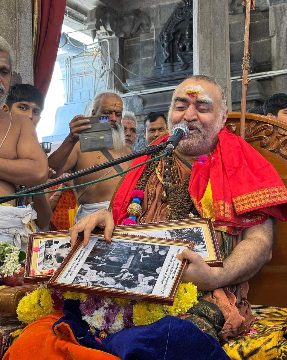 Shri Kanchi Kamakoti Peetadhipati Jagadguru Pujyashri Shankara Vijayendra Saraswathi Shankaracharya Swamigal visited Shri Karpagambalam sameta Sri Kapaleeshwara Swami Temple In Mylapore, Chennai this morning (5 Oct. 2025). The temple officials and priests accorded traditional swagatam with poornakumbham. Visesha pujas were performed. Aabharanam (nose-stud) samarpanam was performed and adorned to Sri Karpagambal. A large number of devotees witnessed the event. Pujyashri Shankaracharya Swamigal blessed the devotees with Anugraha Bhashanam.