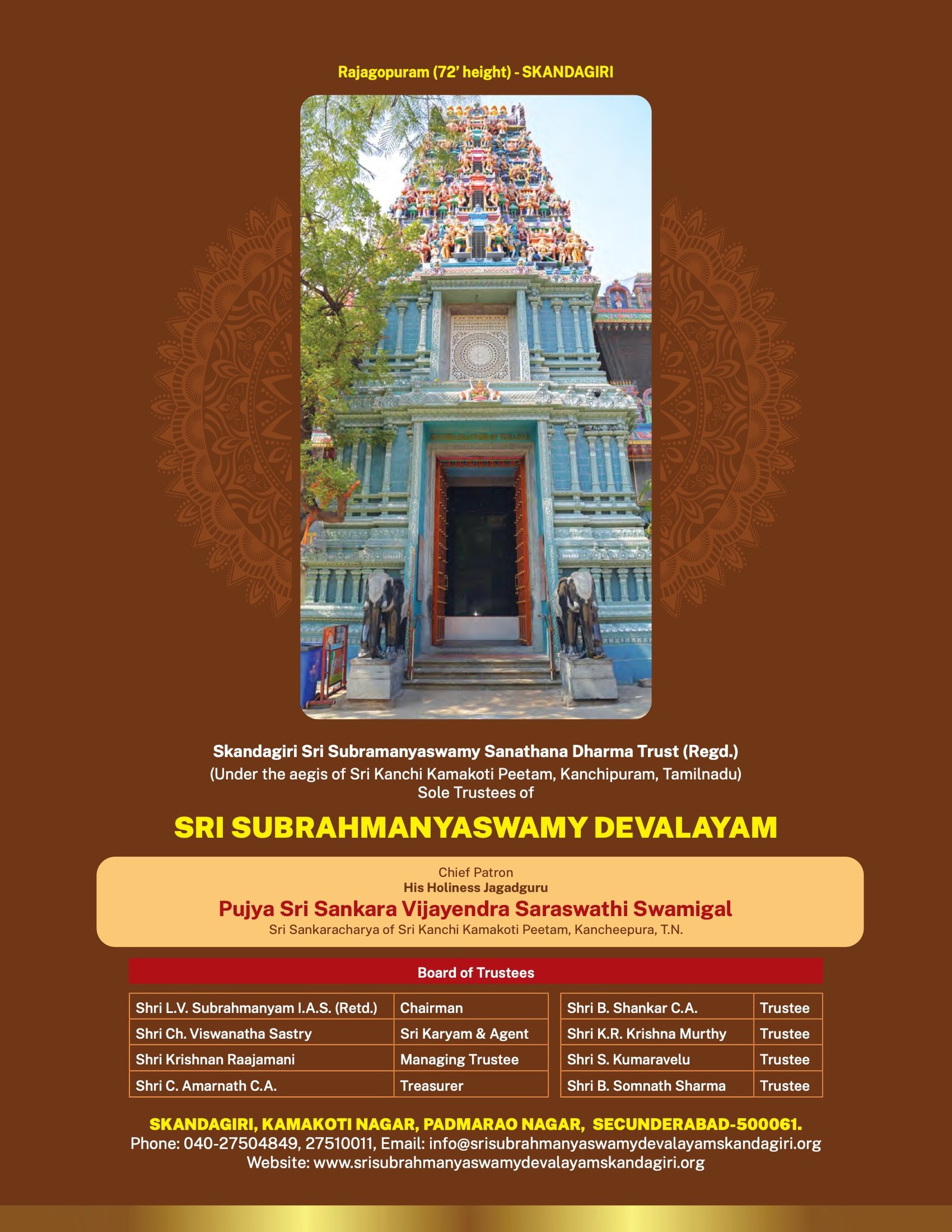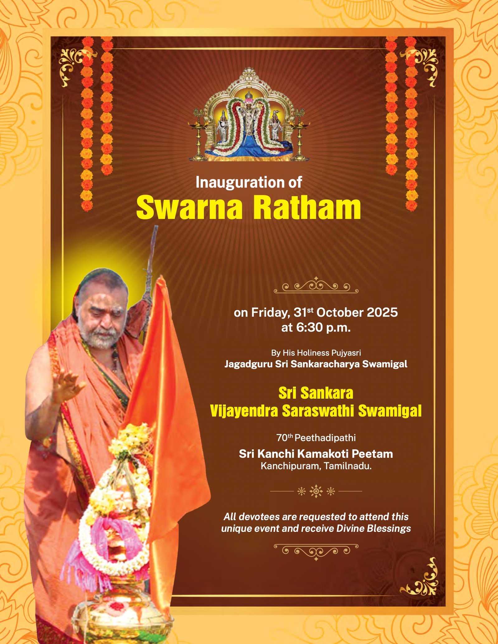 Shri Kanchi Kamakoti Peetadhipati Jagadguru Pujyashri Shankara Vijayendra Saraswathi Shankaracharya Swamiji will bless and inaugurate the Swarna Ratham at Shri Subrahmanya Swami Devalayam, Skandagiri, Secunderabad on 31st October 2025 at 6.30 pm