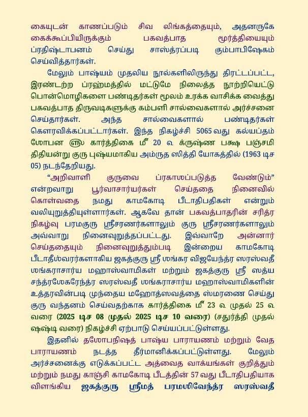 Pujyashri Baghavadpada Paduka Pradishta Dina Varshika Mahotsavam (8-Dec-2025 to 10 Dec 2025) scheduled at Shri Kanchi Matham, #Thiruvidaimarudur Kshetram. It\\\'s a great opportunity to listen to Advaita Vidwans Upanyasams & Parayanams. Pujyashri Shankara Vijayendra Saraswathi Shankaracharya Swamigal will bless the event on 10th Dec. 2025 பகவத்பாத பாதுகா ப்ரதிஷ்டா தின வார்ஷிக மஹோத்ஸவம் காஞ்சீ ஸ்ரீமடம் ஸம்ஸ்தானம் திருவிடைமருதூர்