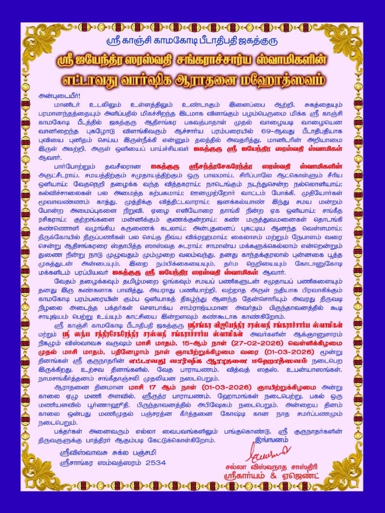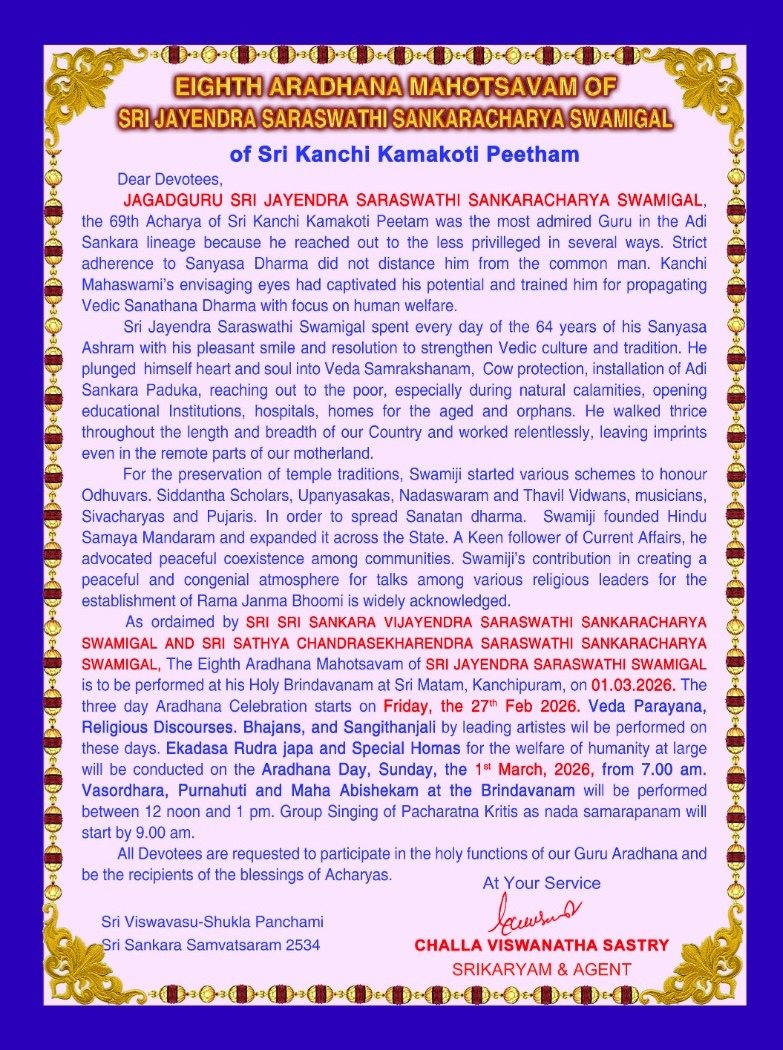 The eighth Varshika Aradhana of HH Pujyashri Jayendra Saraswati Shankaracharya Swamigal will be performed on 1st March 2026 at the holy precincts of His Brindavanam at Shrimatam.