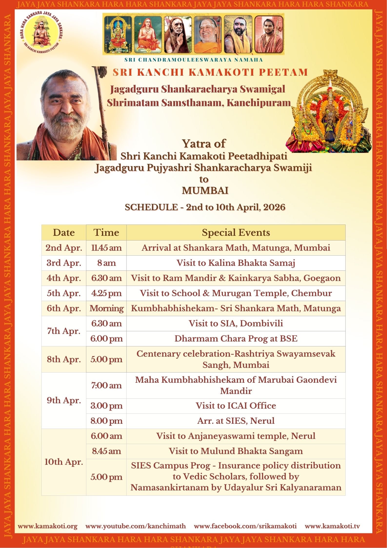 Yatra of Shri Kanchi Kamakoti Peetadhipati Jagadguru Pujyashri Shankara Vijayendra Saraswathi Shankaracharya Swamigal to Mumbai and Karnataka - 2nd to 14th April 2026