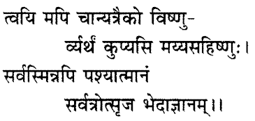 In you, in me, and elsewhere too, there is but one Visnu (God). Vainly do you get angry with me, being impatient. See the Self in all things, and leave off everywhere ignorance which is cause of difference.