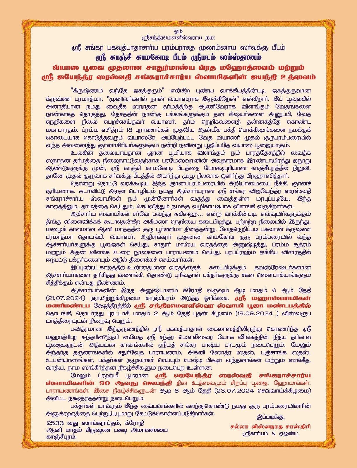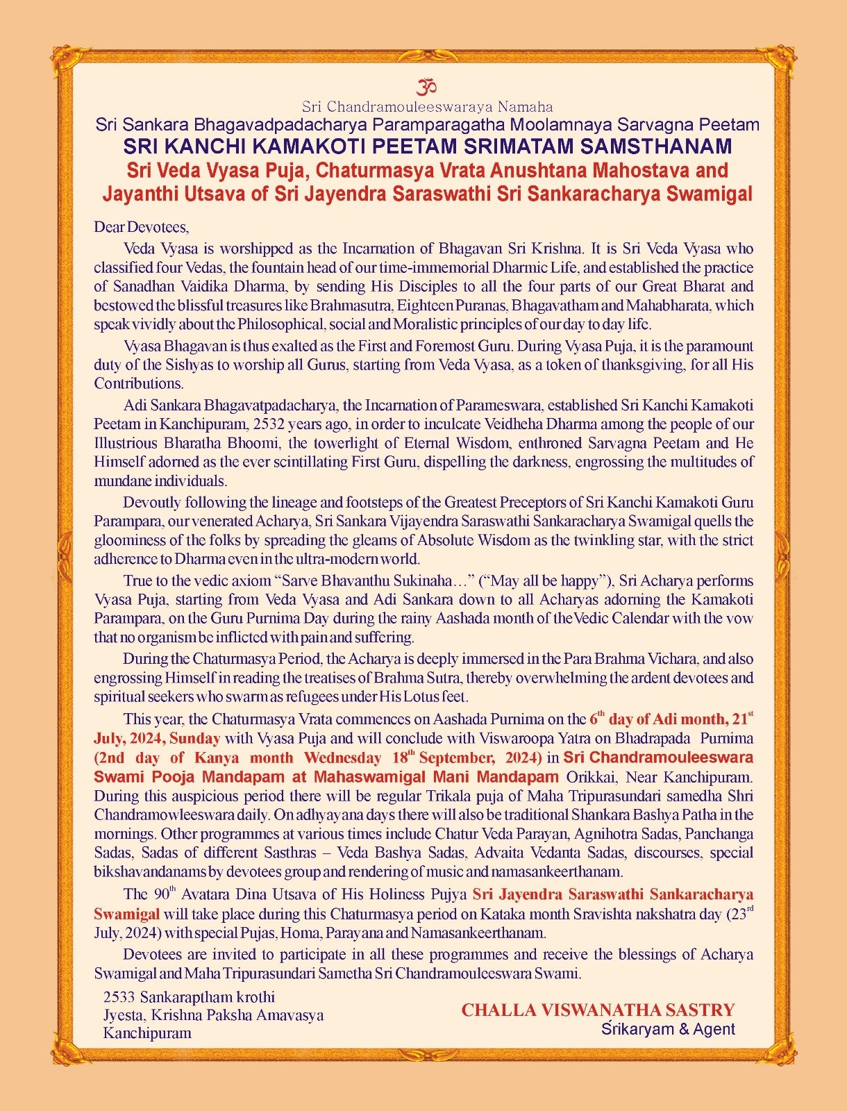 HH Jagadguru Pujyashri Shankara Vijayendra Saraswathi Shankaracharya Swamigal will perform Vyasa Puja on 21st July 2024 & Chaturmasya Vratam at at Orikkai, near Kanchipuram from 21st July to 18th September 2024 (Viswaroopa Yatra).