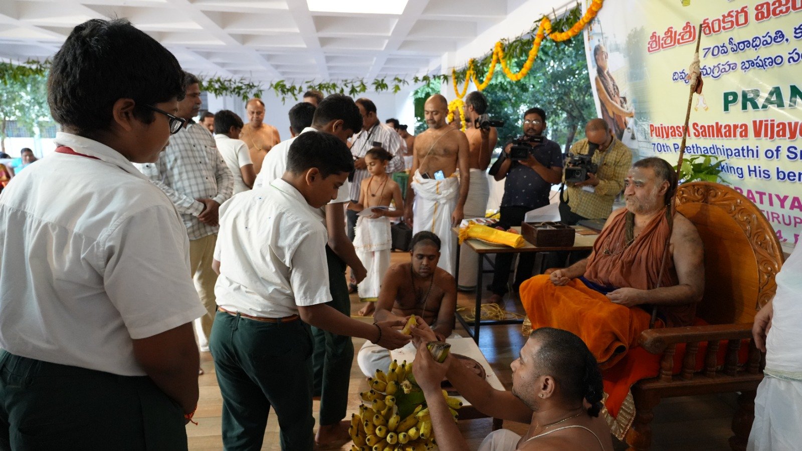 Pujyashri Shankara Vijayendra Saraswathi Shankaracharya Swamiji visited the Bharatiya Vidya Bhavan\'s Sri Venkateswara Vidyalaya at the foothills of Tirumala hills in Tirupati (near Alipiri) and blessed the management, teachers and students this evening (2 Nov. 2024). His Holiness gave anugraha bhashanam and blessed the students with Prasadam. The Vidyalaya strives to blend the heritage, culture, values, and wisdom of glorious ancient India with the constantly changing needs and aspirations of modern society.