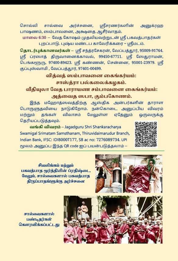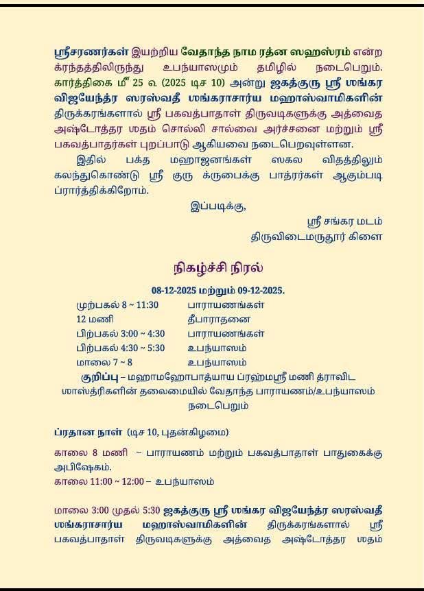 Pujyashri Baghavadpada Paduka Pradishta Dina Varshika Mahotsavam (8-Dec-2025 to 10 Dec 2025) scheduled at Shri Kanchi Matham, #Thiruvidaimarudur Kshetram. It\\\'s a great opportunity to listen to Advaita Vidwans Upanyasams & Parayanams. Pujyashri Shankara Vijayendra Saraswathi Shankaracharya Swamigal will bless the event on 10th Dec. 2025 பகவத்பாத பாதுகா ப்ரதிஷ்டா தின வார்ஷிக மஹோத்ஸவம் காஞ்சீ ஸ்ரீமடம் ஸம்ஸ்தானம் திருவிடைமருதூர்
